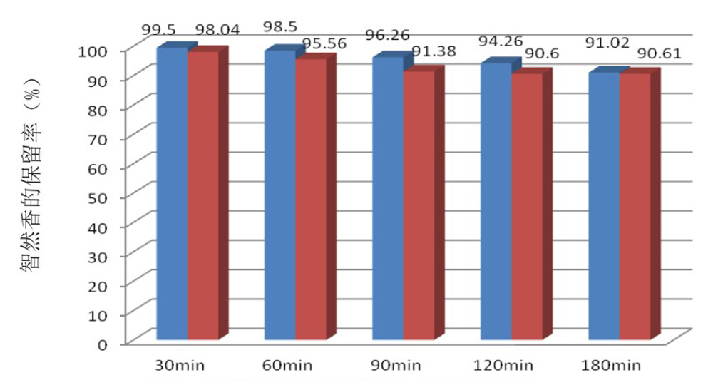 表2 “智然香”在高温下(80℃、90℃)不同时间段的保留率(%)