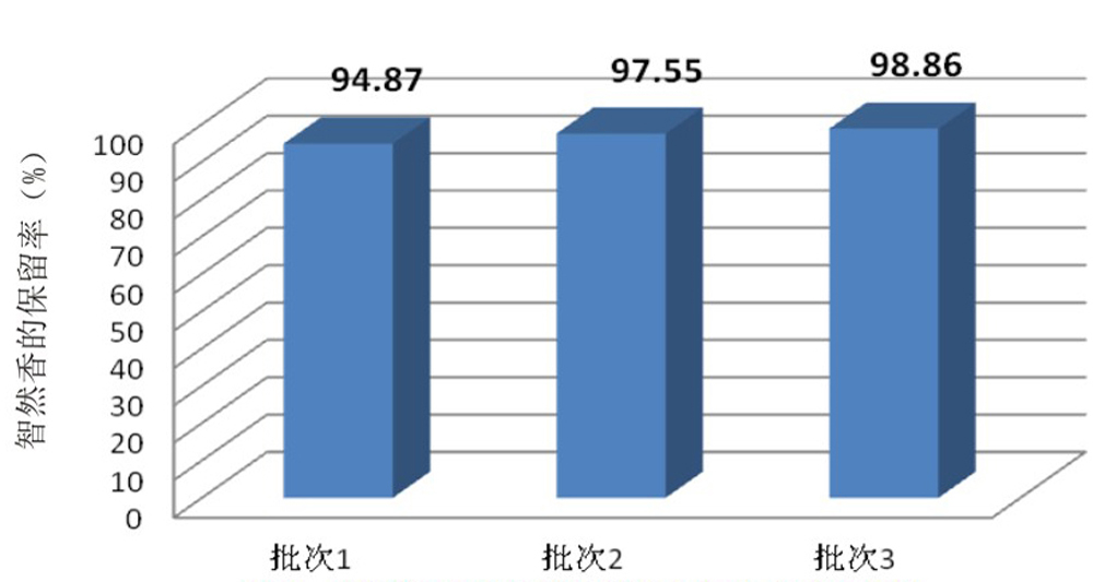 智然香在自然条件下,储存180天后,其保留率可达到99.13%;在80℃、90℃高温下,3h后智然香的保留率分别可达到91.02%和90.61%;智然香经过高温制粒后,保留率可到94.87-98.86%;智然香在颗粒饲料中,在自然条件下储存20天后保留率可达到90.70-93.32%。所以,在本试验条件下,智然香(植物精油)中活性成分,经过稳定化技术处理之后,在不同条件下具有良好的保留率。