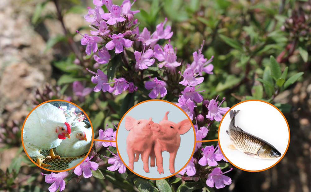将智然香和饲料混合,用蒸汽加热调质,设定进料温度为95-100℃,制粒,冷却。测定颗粒的水分,将饲料颗粒粉碎,再检测饲料中植物精油的有效含量(以干物质计)。