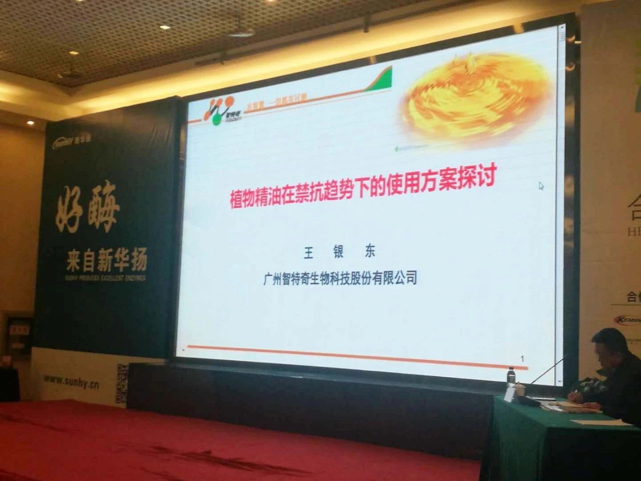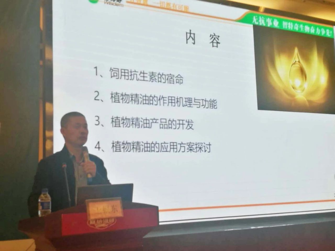 报告中,王银东博士主要从植物精油作用机理与功能、植物精油的抗菌抑菌机理、植物精油抗菌使用方案探讨等几个方面内容,并结合智特奇生物近年来用微胶囊包膜精油“智然香”系列产品在仔猪料、肉禽、蛋禽、水禽以及水生动物实验研究分析成果,给出了“智然香”系列产品替代抗生素的最佳用量及使用方案推荐。最后提出,植物精油将在禁抗趋势下,发挥越来越重要的作用。