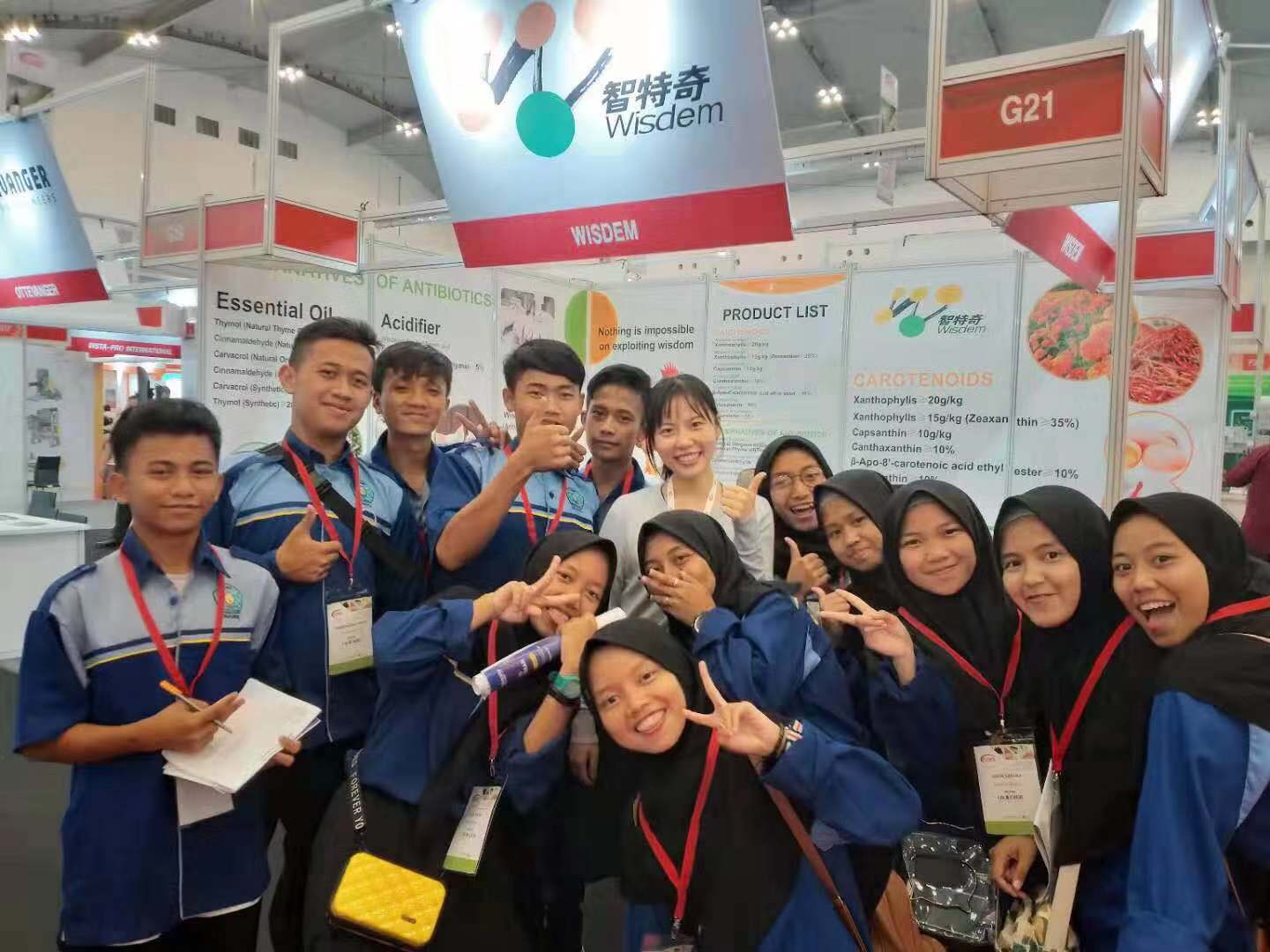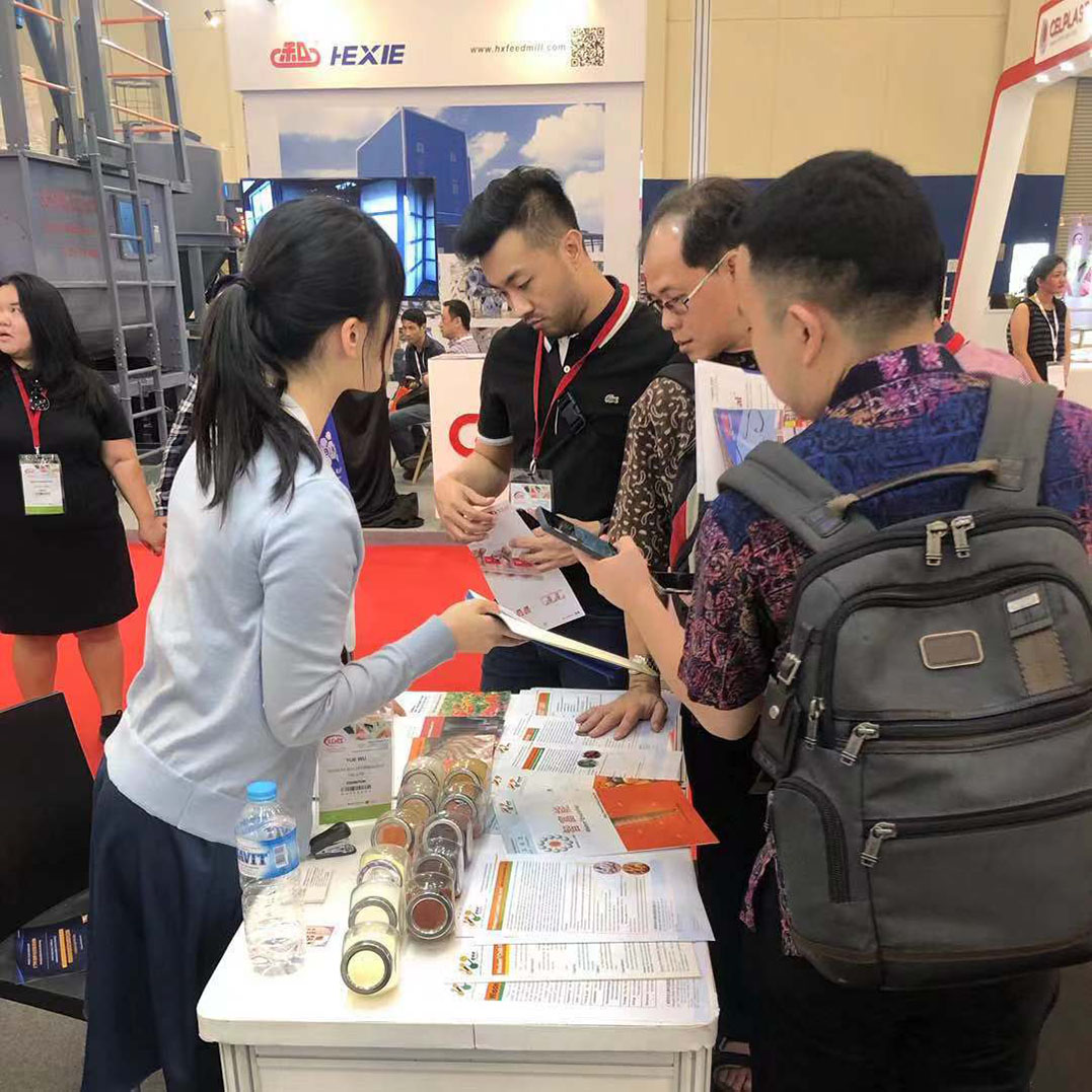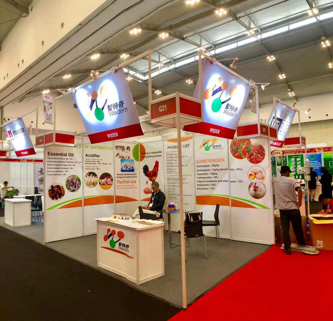 在此次展会上,我司结合印尼当地畜牧业的现状,重点向客户介绍了微胶囊包膜缓释植物精油“智然香”系列、酸化剂“智长健”系列等替抗产品,吸引了众多大型饲料和养殖企业前来围观,取得了很好的宣传效果。同时,众多参展饲料企业主动到我司展位交流探讨精油及酸化剂产品的作用机理及实际应用效果。