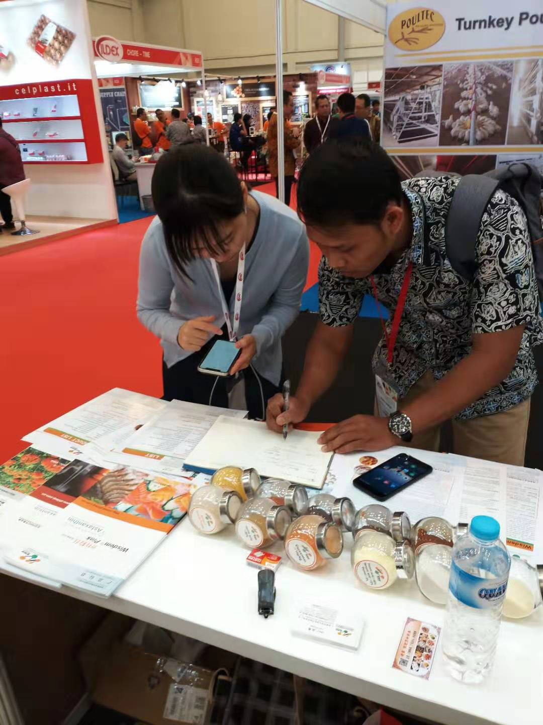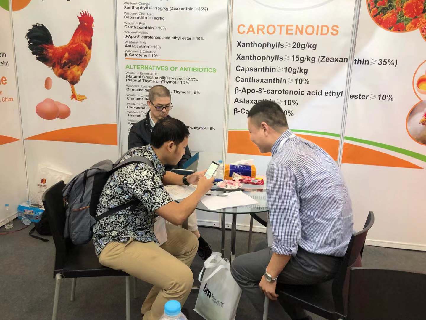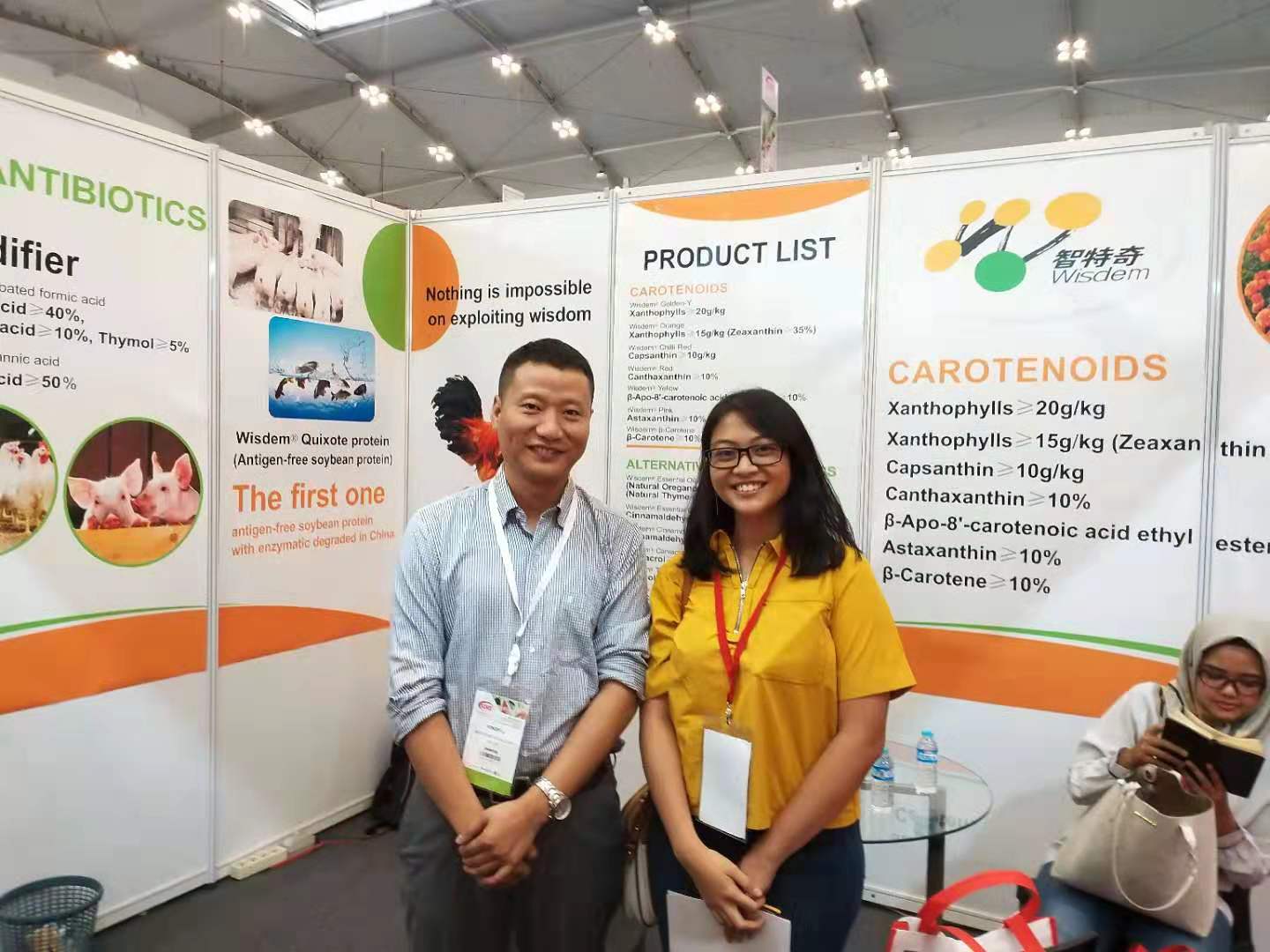 在此次展会上,我司结合印尼当地畜牧业的现状,重点向客户介绍了微胶囊包膜缓释植物精油“智然香”系列、酸化剂“智长健”系列等替抗产品,吸引了众多大型饲料和养殖企业前来围观,取得了很好的宣传效果。同时,众多参展饲料企业主动到我司展位交流探讨精油及酸化剂产品的作用机理及实际应用效果。
