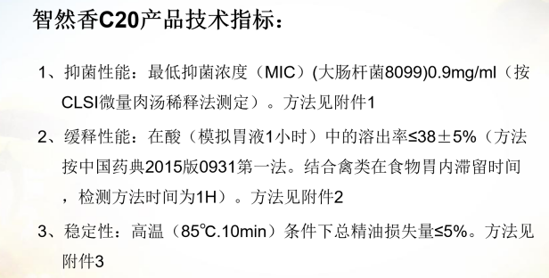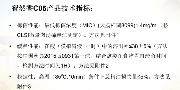 其中王博士重点介绍了智特奇生物植物精油的生产工艺(智特奇生物植物精油加工艺:智特奇生物针对不同植物精油的有效成分及特点,采用不同的工艺,主要有融嵌工艺和微胶囊工艺)和智特奇生物植物精油产品“智然香C05”和“智然香C20”的质量标准(包括外观与性状、粒度、主成份含量等)和技术指标(包括抑菌性能、缓释性能、稳定性等)。