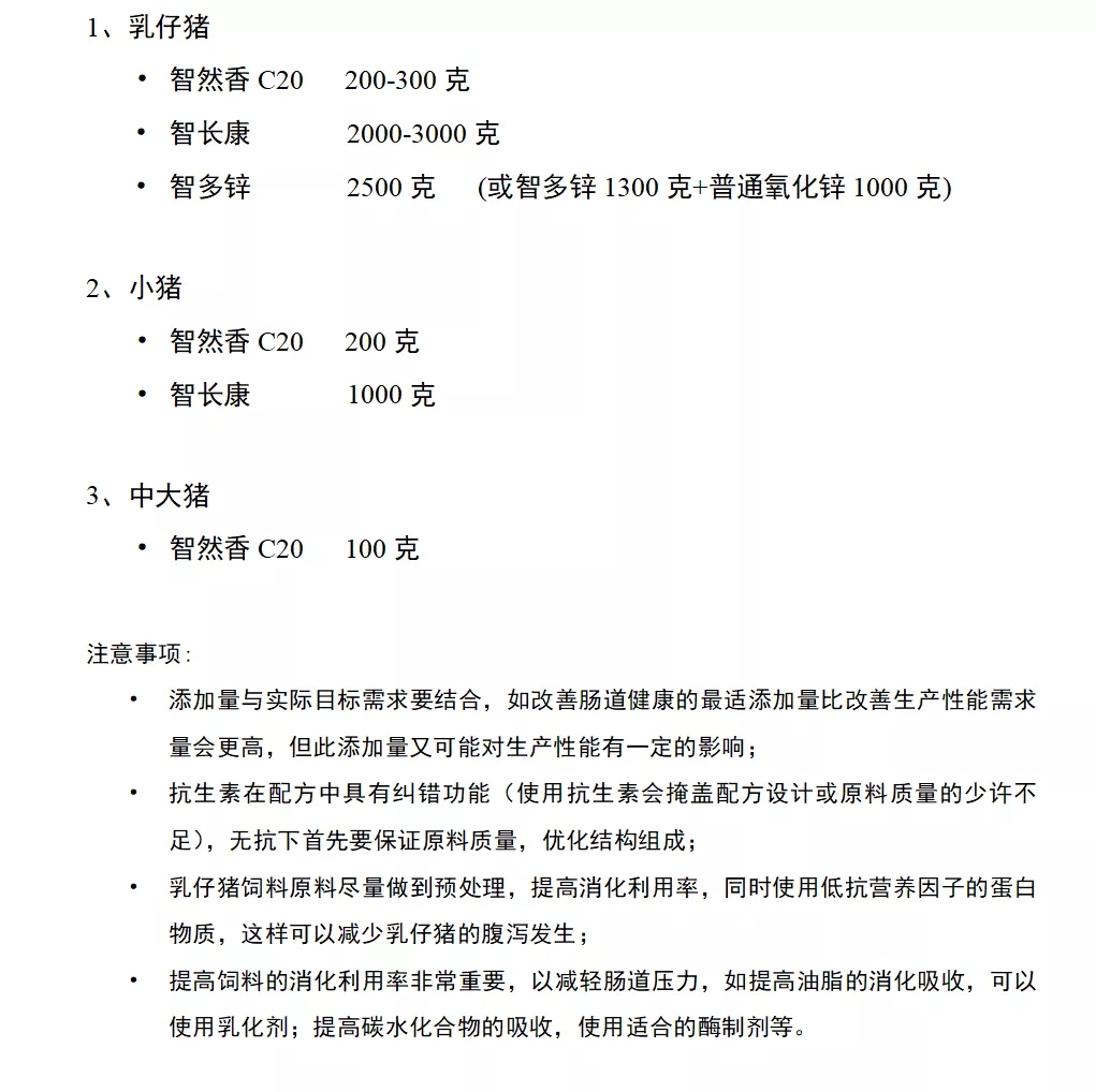 (2)猪日粮无抗方案推荐如下(每吨全价配合饲料中添加量):