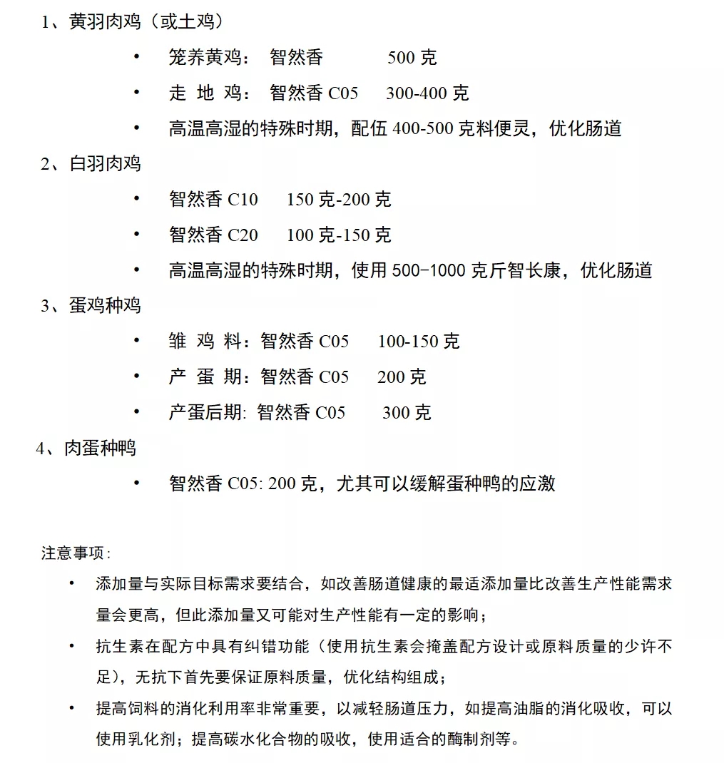 (1)家禽日粮无抗方案推荐如下(每吨全价配合饲料中添加量):