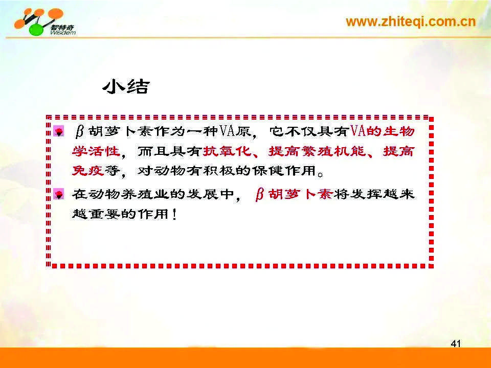 智特奇生物技术总监王银东博士在会上作了《β-胡萝卜素的功能与应用》的技术报告,王博士主要从β-胡萝卜素的来源、结构特性、功能和应用效果几个方面进行了阐述,并提出:β-胡萝卜素作为一种VA原,它不仅具有VA的生物学活性,而且具有抗氧化、提高繁殖机能、提高免疫等积极的保健作用,在动物养殖业的发展中,β-胡萝卜素将会发挥越来越重要的作用。