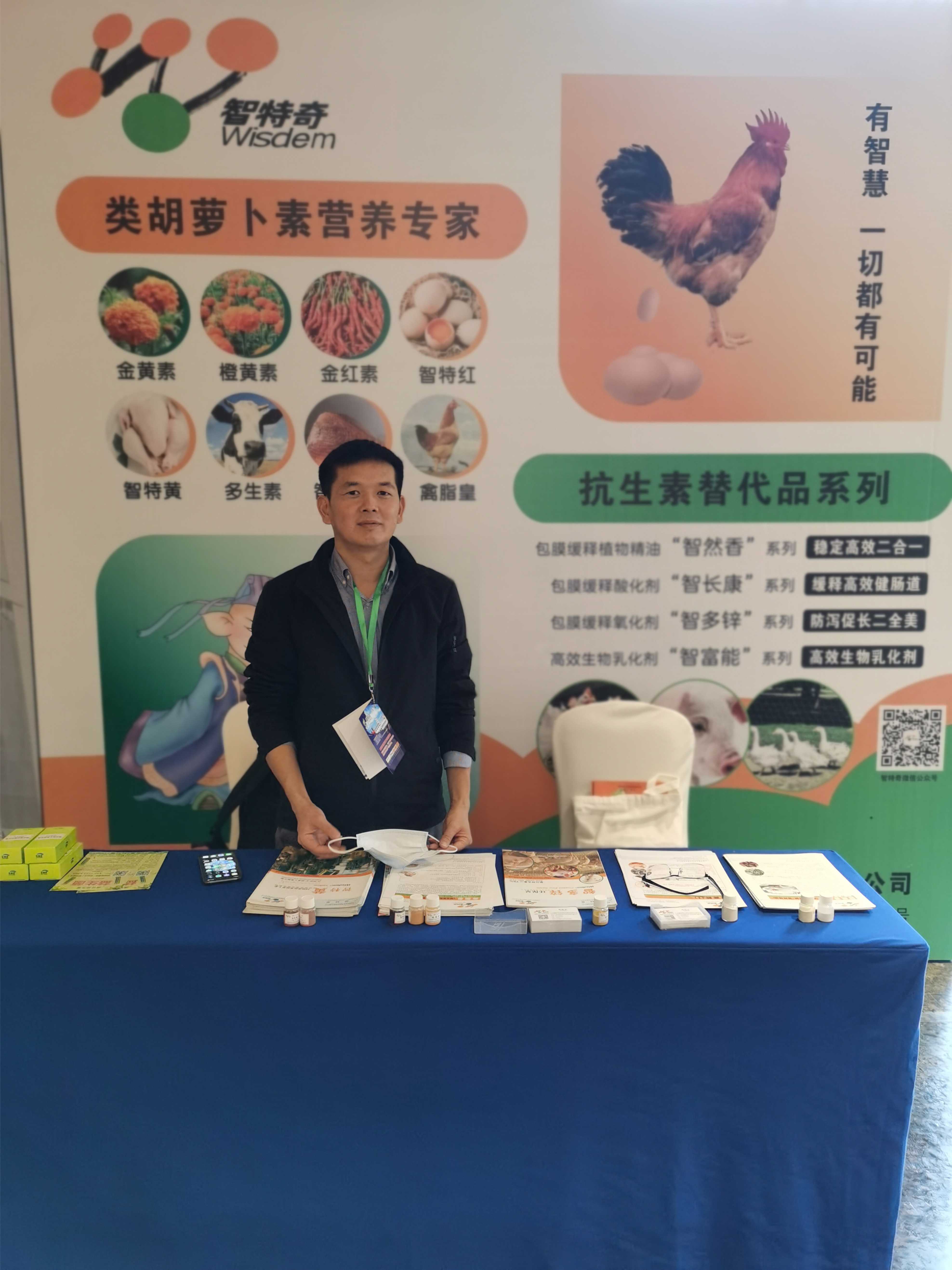 会中间隙,各参会人员热情互动,智特奇在展台展示区域热情接待,分享了智特奇的主要产品——类胡萝卜素系列和抗生素替代品系列产品。