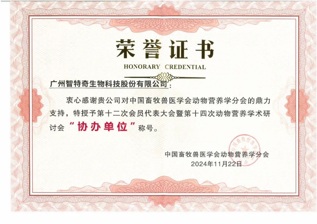 广州智特奇生物凭借多年优质的类胡萝卜素产品,及优质的客户服务,荣获中国畜牧兽医学会动物营养学分会理事单位称号。
