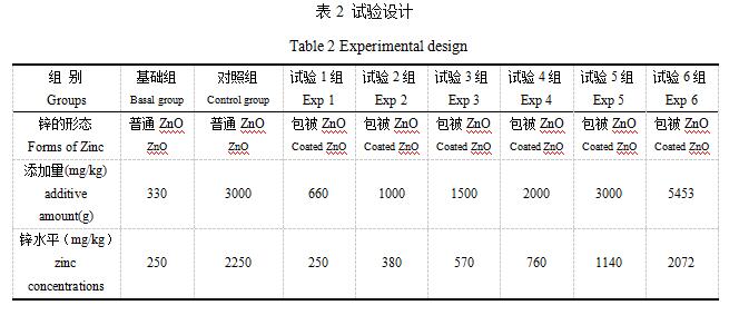 锌是动物健康生长所必需的微量元素之一,大量研究表明,高剂量的氧化锌不但具有促进仔猪生长的作用,而且可以减少断奶仔猪腹泻率[1,2]。但氧化锌的生物利用率低,大部分的锌从粪便中排出,造成锌源浪费及对环境的污染[3]。包被氧化锌因其包衣材料的保护,可减少其在胃和小肠中的解离,保证大部分能以氧化锌分子态到达后肠发挥功效,从而减少使用剂量。本试验旨在研究不同水平的包被氧化锌对断奶仔猪生产性能的影响,确定其最适添加浓度范围,为实际应用提供理论参考。