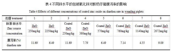 4.1与普通氧化锌相比,日粮中添加包被氧化锌可降低断奶仔猪料重比和腹泻率,提高仔猪生产性能。