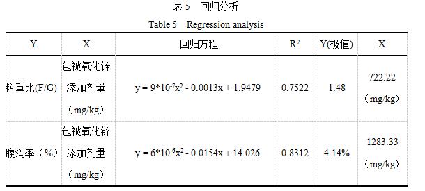 通过试验得到的不同添加水平包被氧化锌与断奶仔猪料重比(F/G)及腹泻率的关系,做回归方程,从中可以得到包被氧化锌的适宜添加水平。从表5中可以看出,当包被氧化锌添加量为722.22 mg/kg时,断奶仔猪料重比最低,为1.48。当包被氧化锌添加量为1283.33 mg/kg时,断奶仔猪腹泻率最低,为4.14%。
