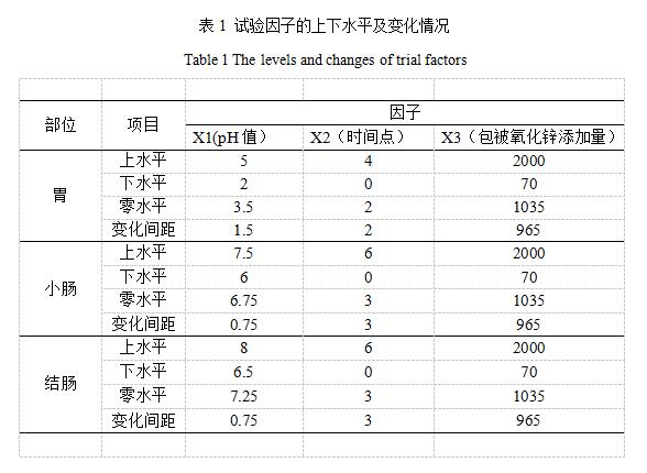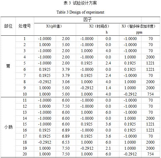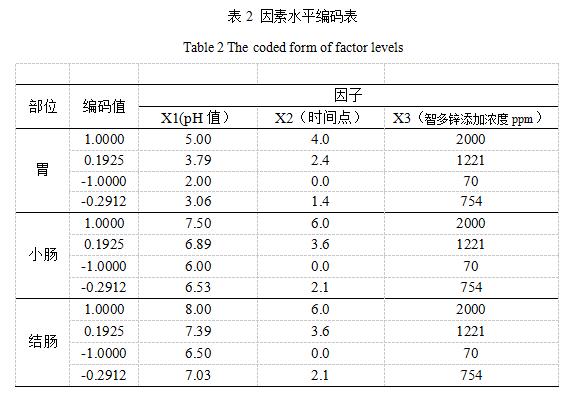 本试验采用3因素二次D饱和最优设计方案[5,6],分胃、小肠、结肠三个部位,每个部位都以pH值、消化时间、包被氧化锌添加浓度为3因素。3个部位的因素水平上下限、编码值、对应的实际值及试验设计方案见表1、2、3。试验每个部位10个处理,共30个处理,每个处理4个重复。