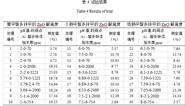 包被氧化锌解离度=(食糜中包被氧化锌添加量-消化后食糜中包被氧化锌含量)/食糜中包被氧化锌添加量)*100%