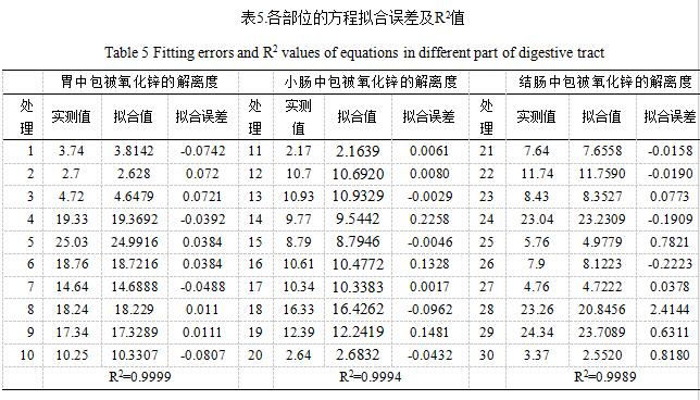 X1、 X2、 X3分别表示pH值、消化时间、包被氧化锌添加浓度,Y1、Y2、Y3分别表示胃、小肠、结肠部位的包被氧化锌解离度。试验的R2及拟合误差值见表4,从中可看出胃、小肠、结肠部位的方程的R2分别为0.9999、0.9994、0.9989,说明所建方程拟合度很好。