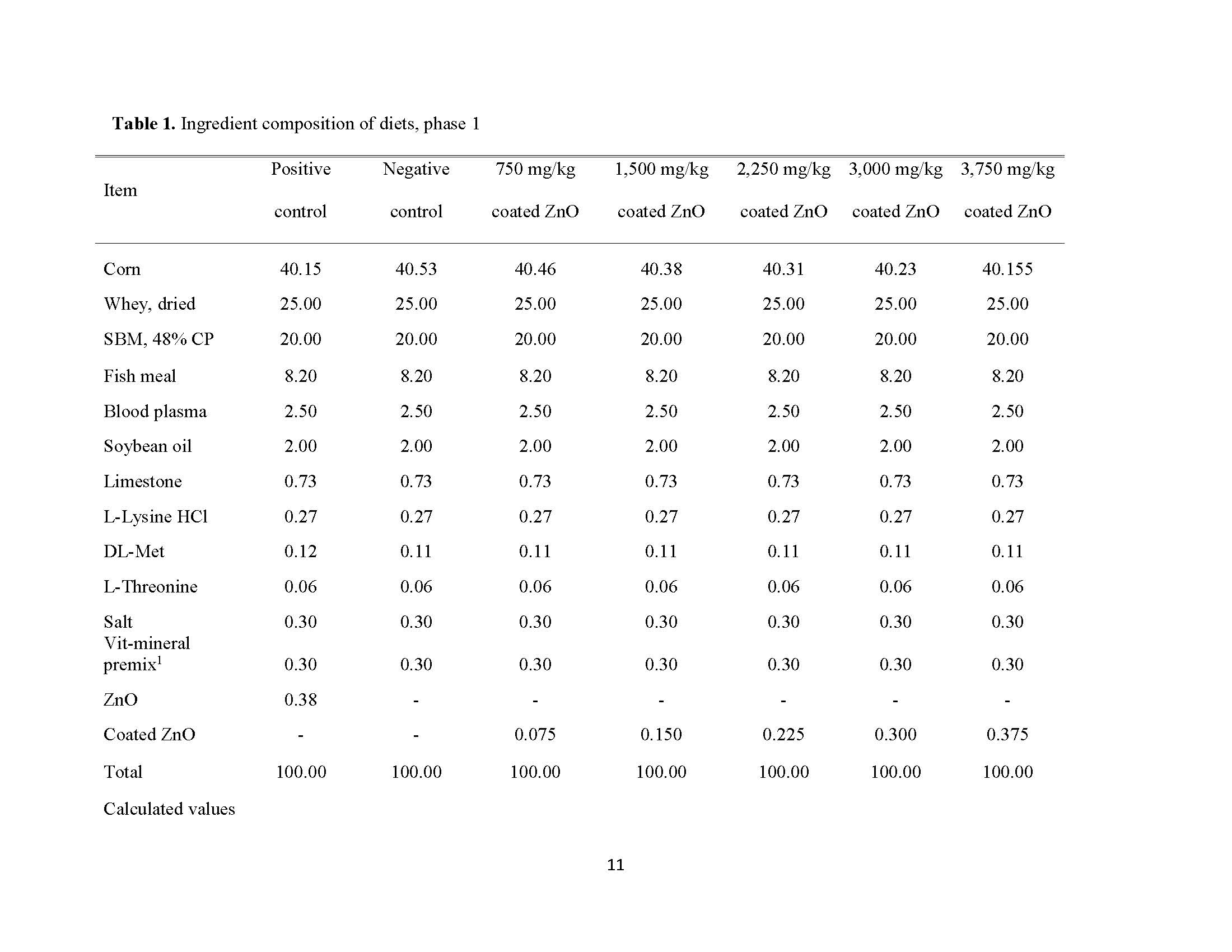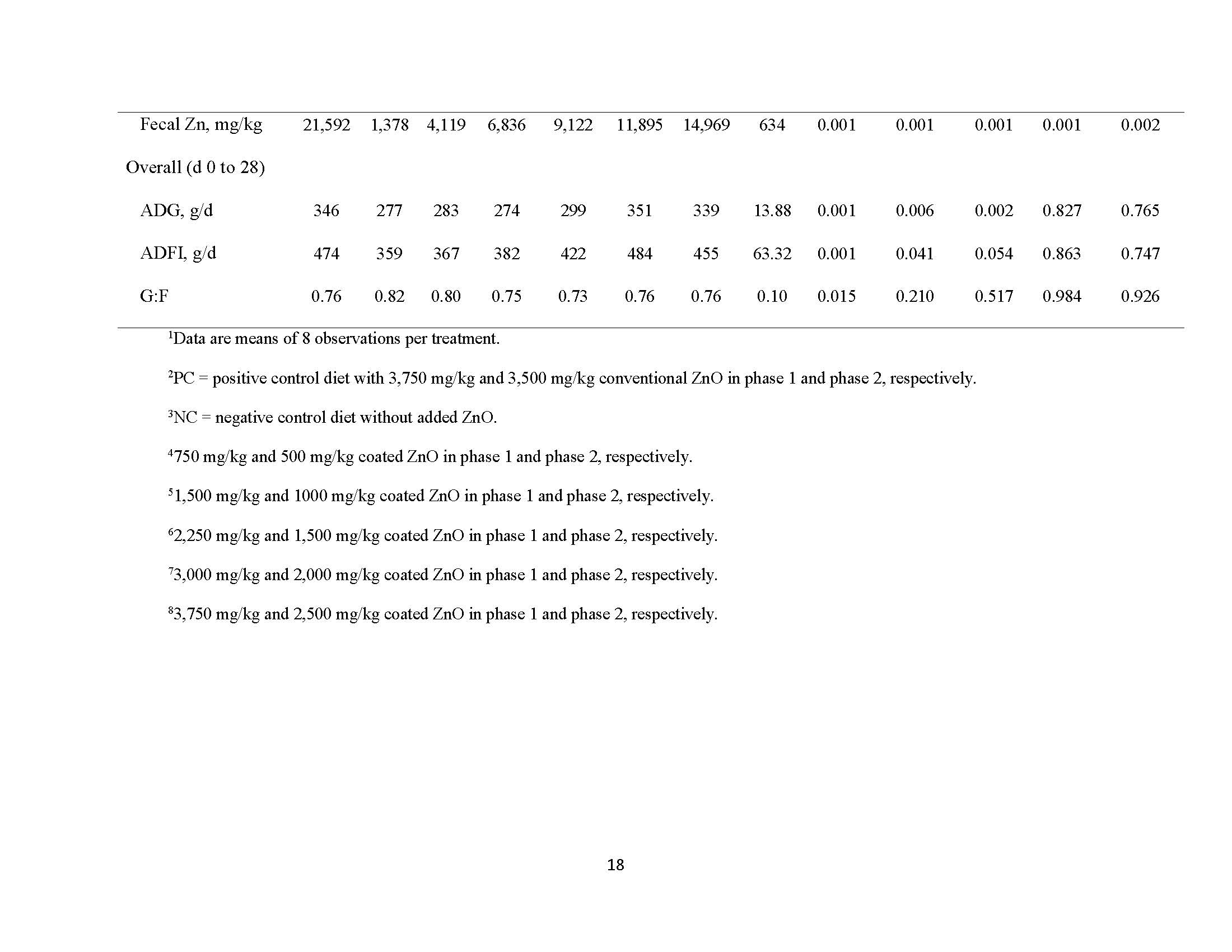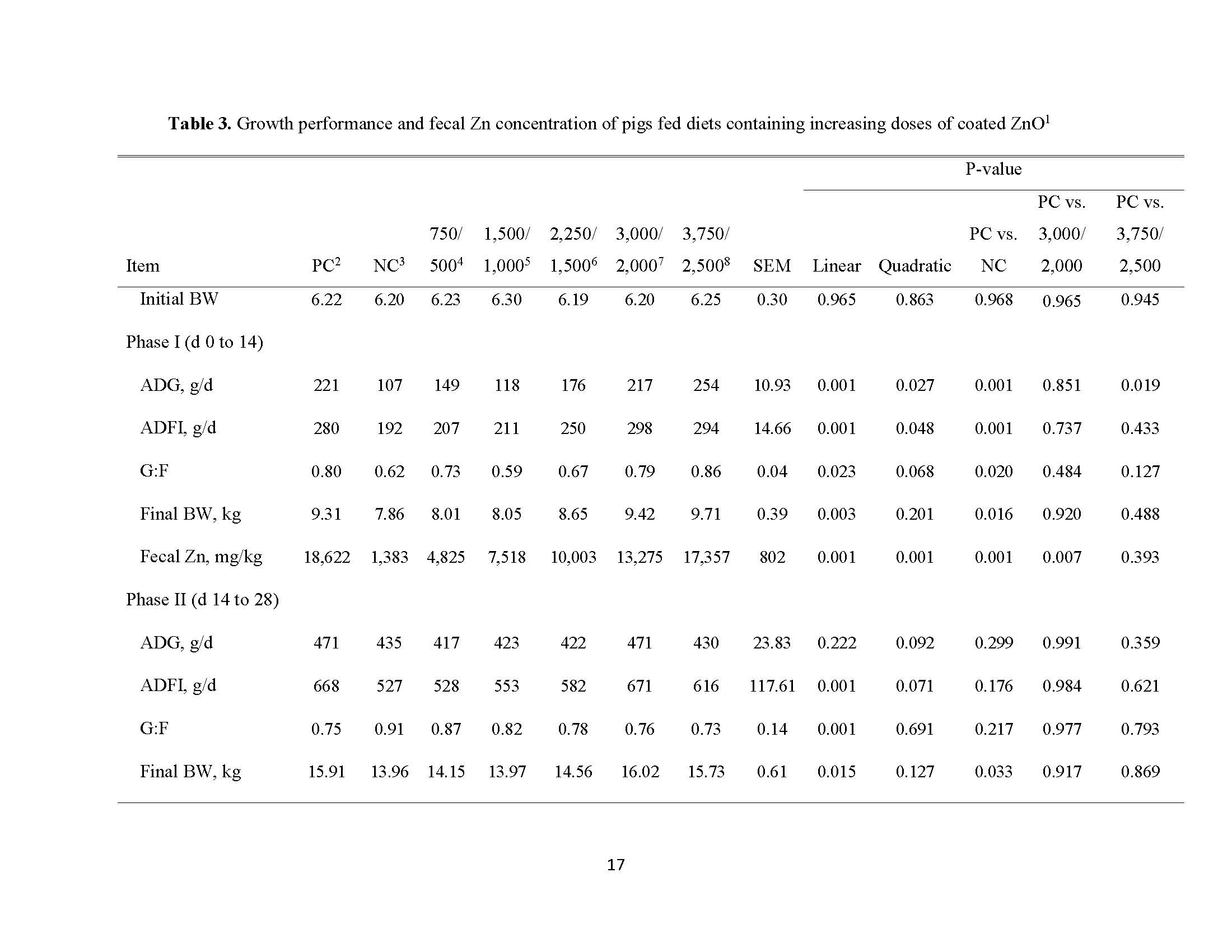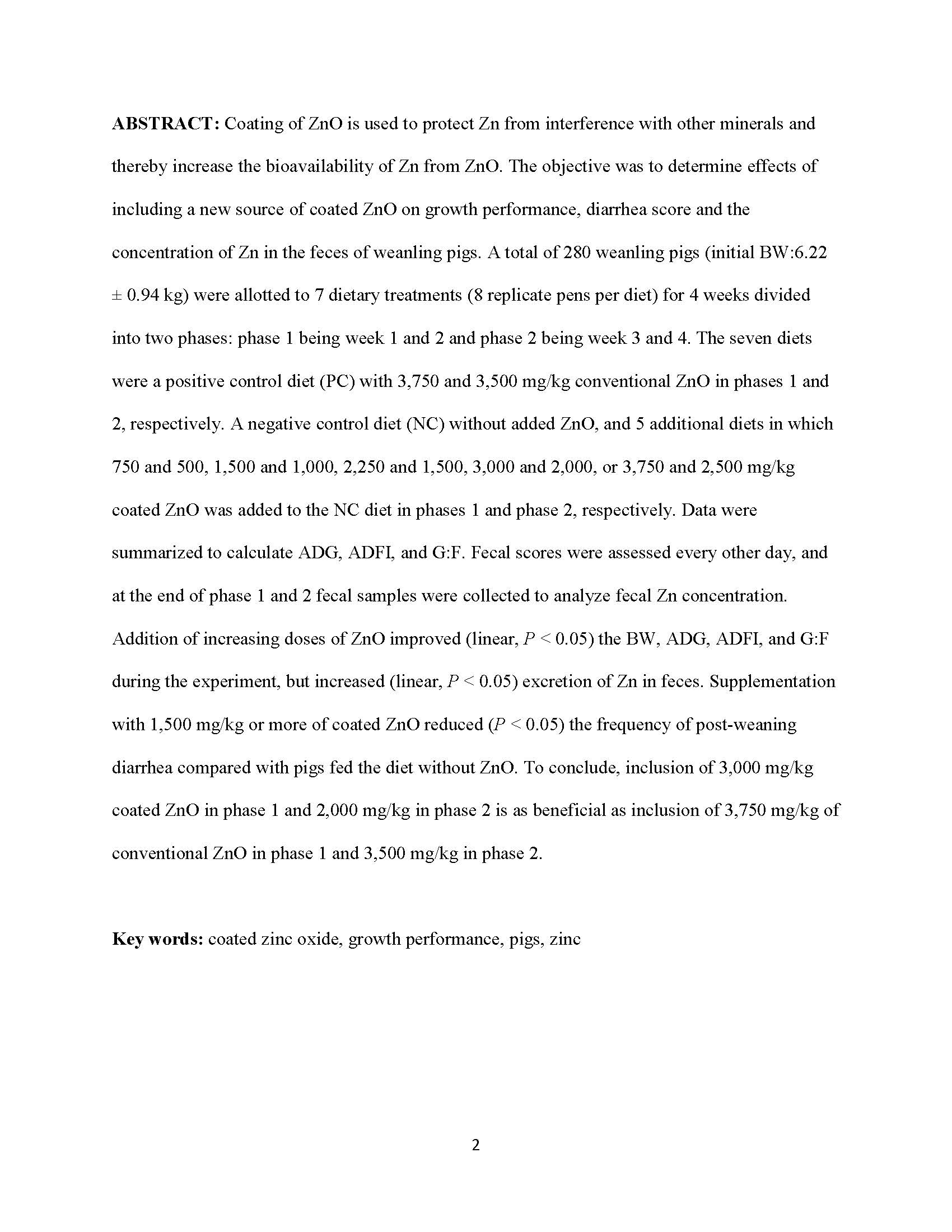 Effects of Graded Levels of Coated ZnO on Performance,Diarrhea Score, Concentrations of Fecal Zn in Weanling Pigs(University of Illinois)