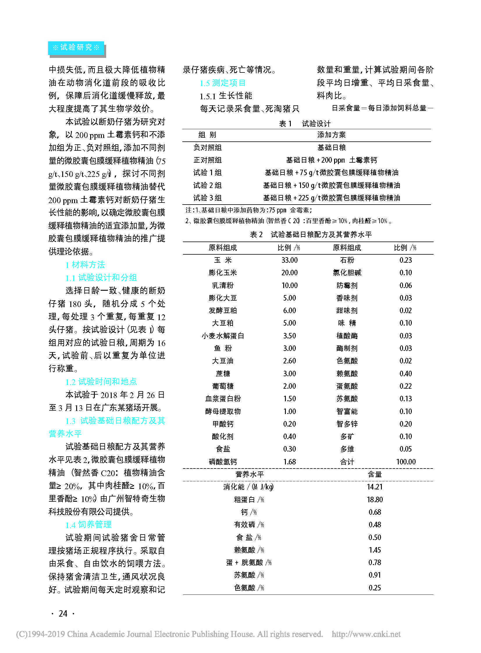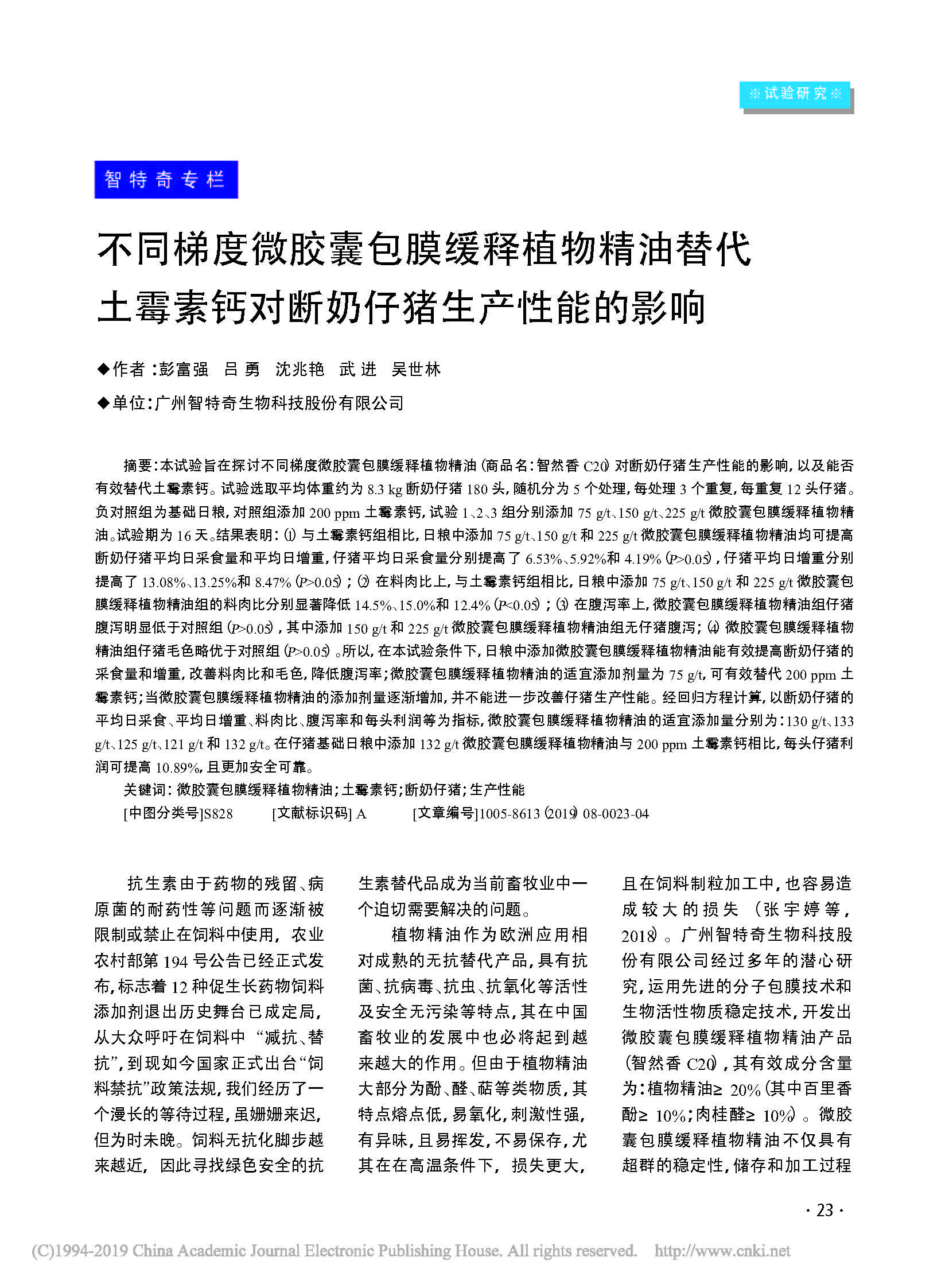 不同梯度微胶囊包膜缓释植物精油(智然香C20)替代土霉素钙对断奶仔猪生产性能的影响