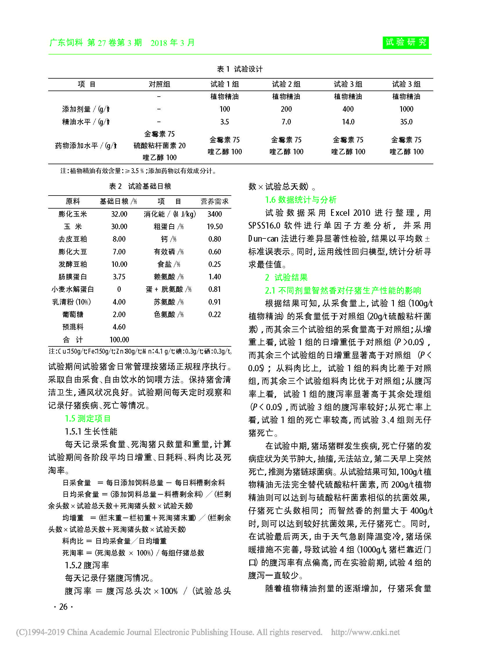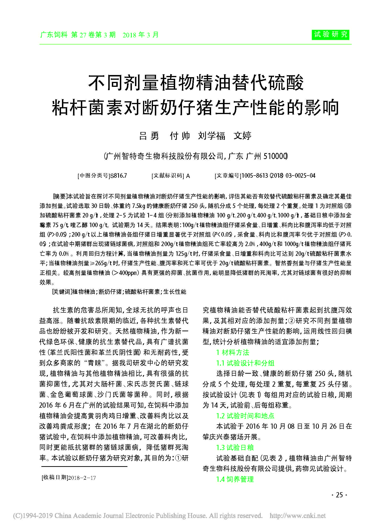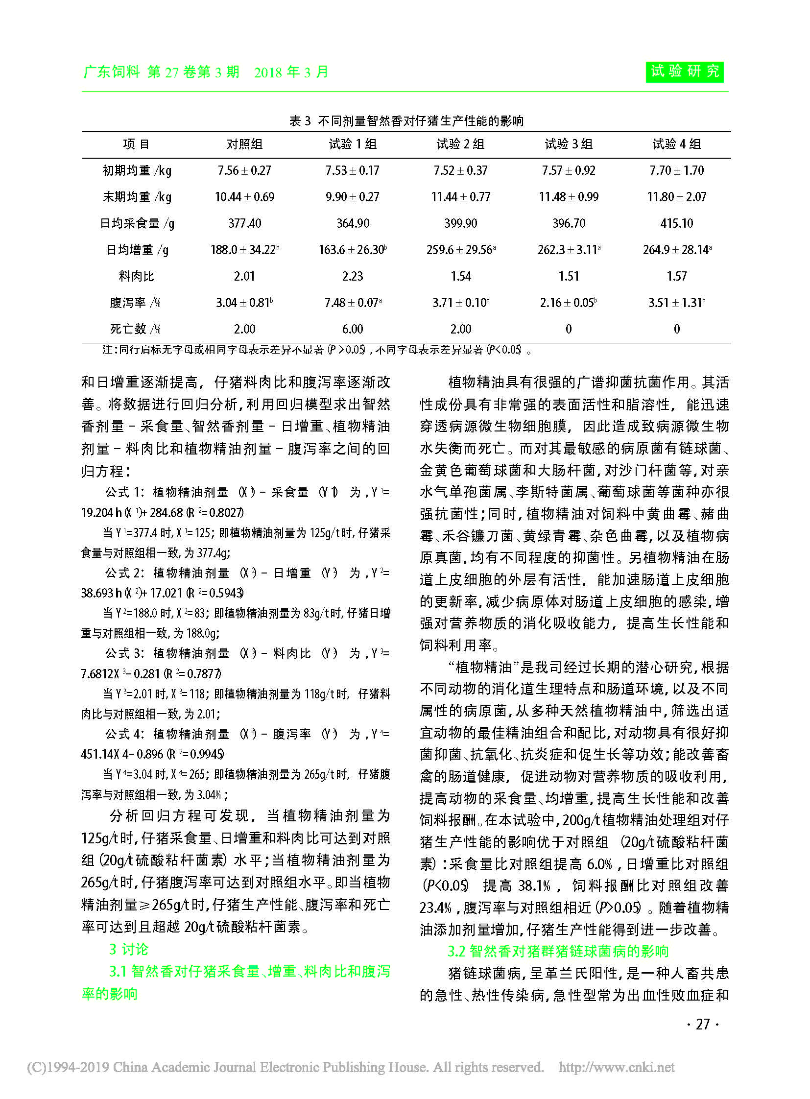 不同剂量植物精油(智然香)替代硫酸粘杆菌素对断奶仔猪生产性能的影响