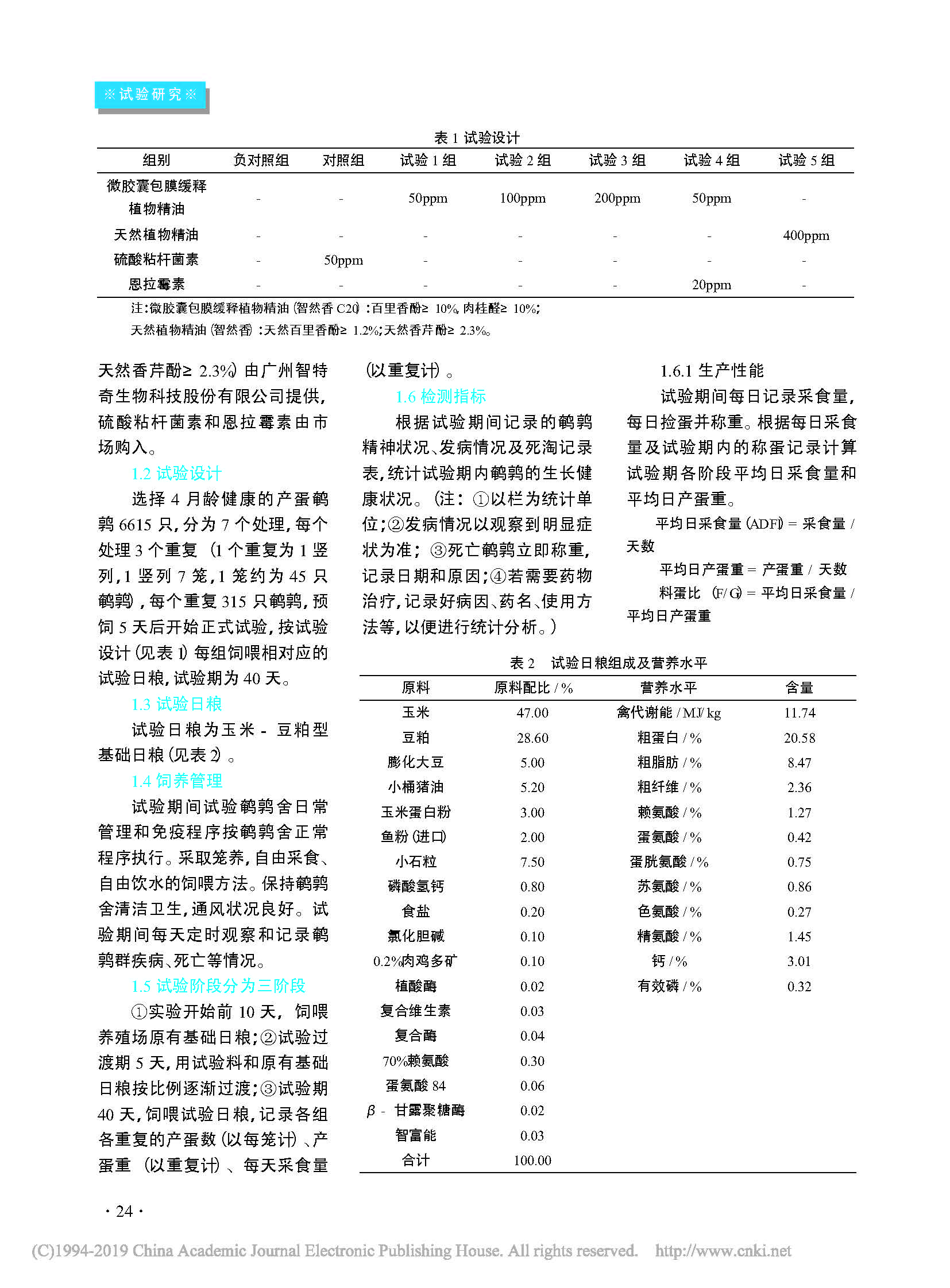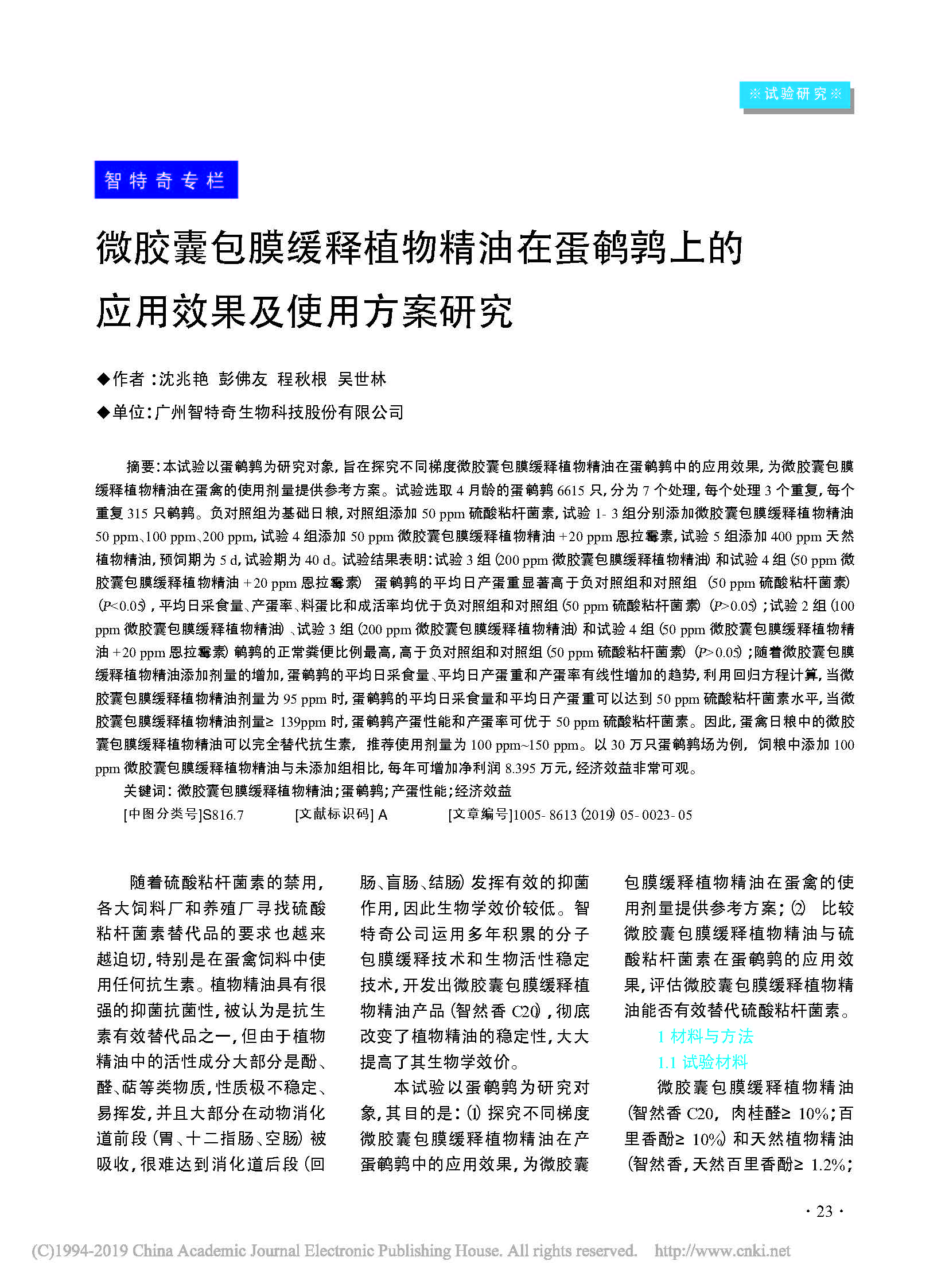 微胶囊包膜缓释植物精油(智然香C20)在蛋鹌鹑上的应用效果及使用方案研究