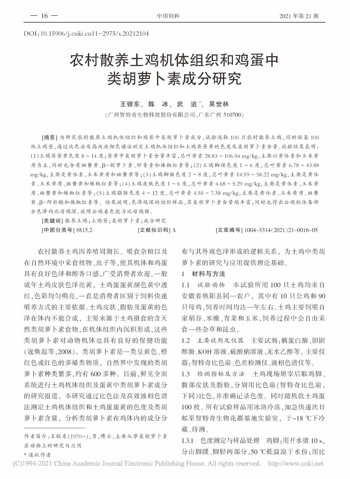 农村散养土鸡机体组织和鸡蛋中类胡萝卜素成分研究