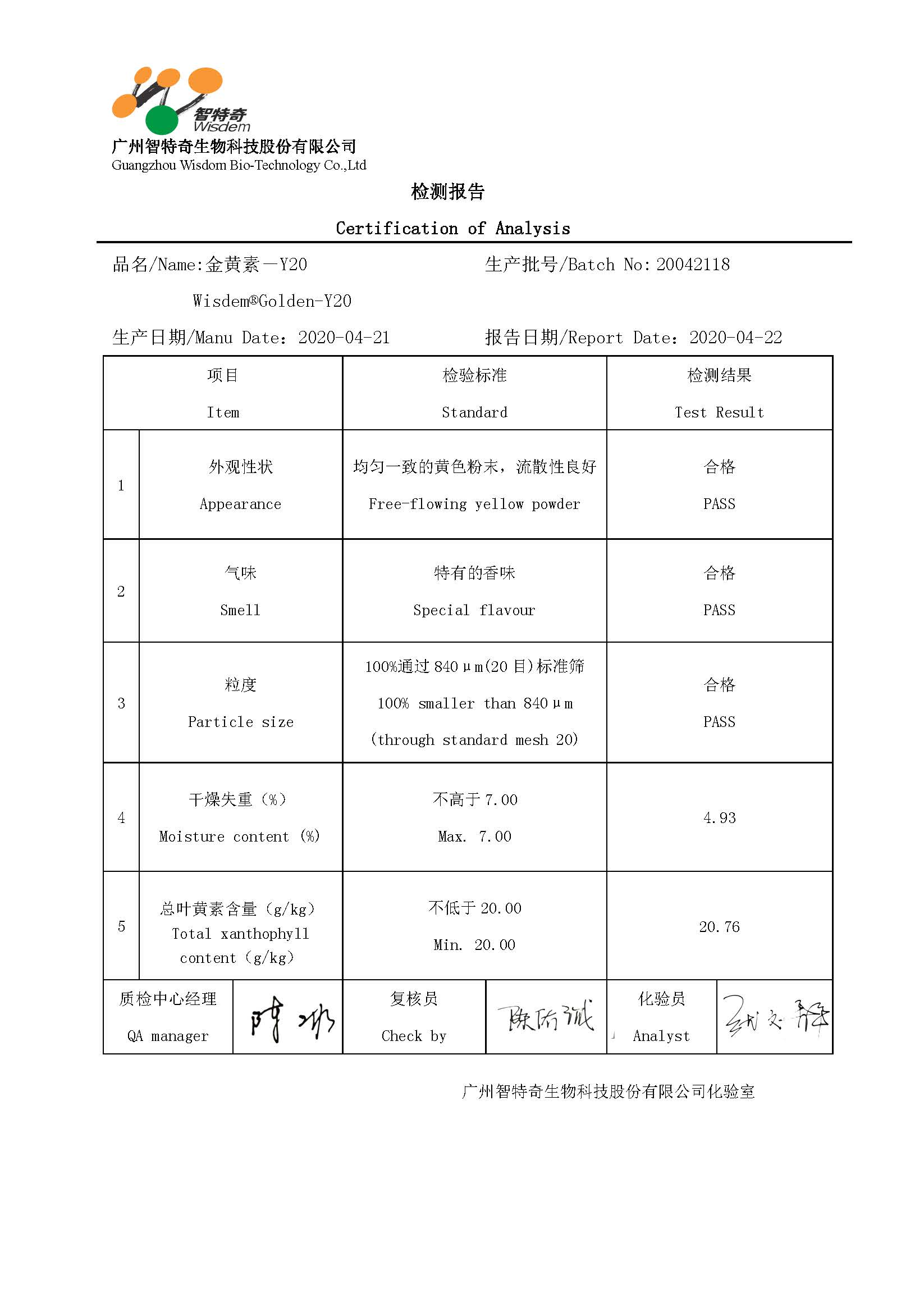 金黄素-Y20内部检测报告