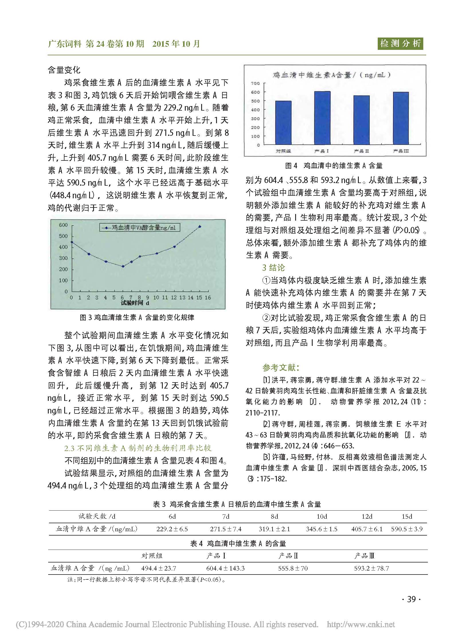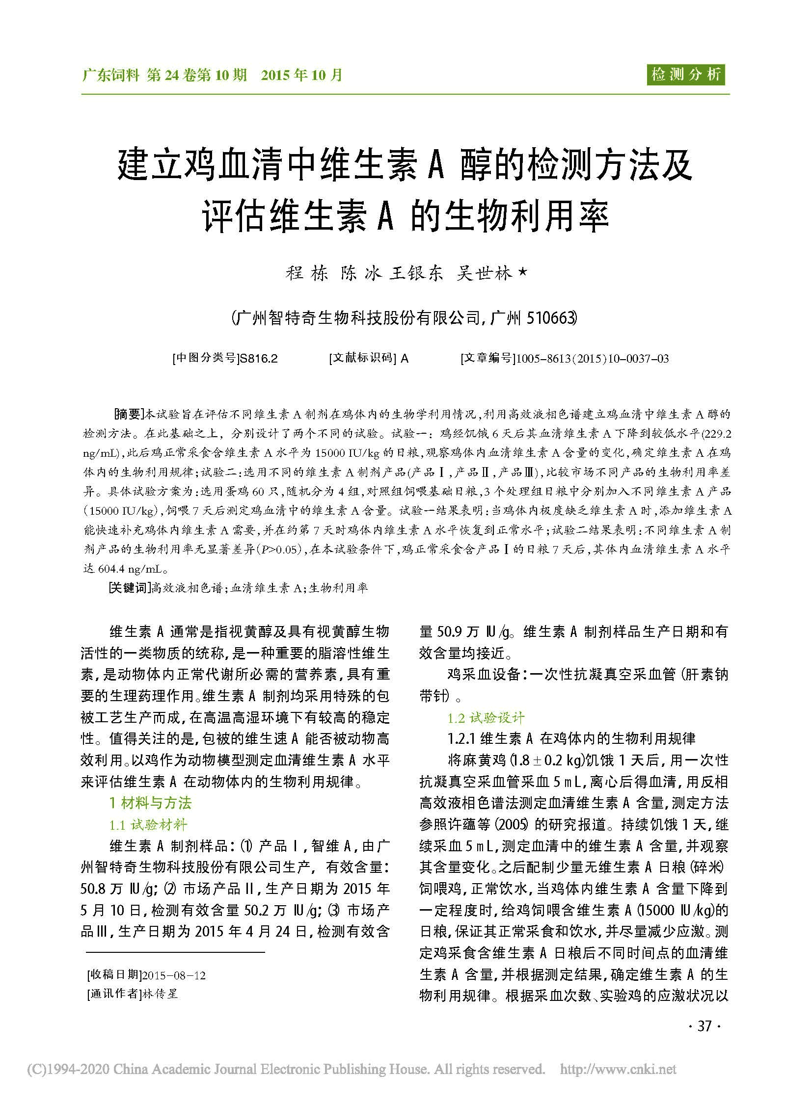 建立鸡血清中维生素A醇的检测方法及评估维生素A的生物利用率